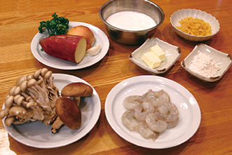 椎茸は5mm幅に切る。にんにくは薄く輪切りにする。 - 鍋にバターと玉ねぎ、さつま芋、にんにくを入れて火にかけ全体に油がまわったら、きのこと白ワインを入れて炒める。