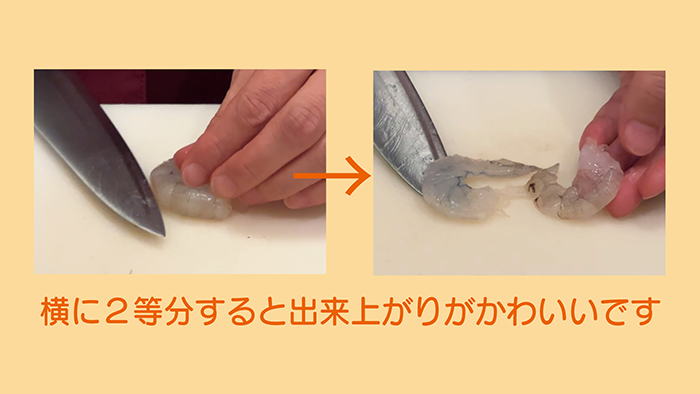 - むき海老は2等分にして、塩と酒で下味を付ける。
